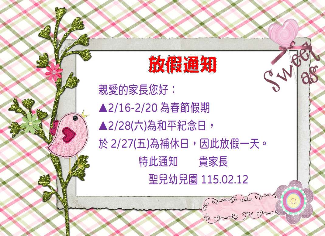 聖兒幼兒園春節假期與和平紀念日放假通知