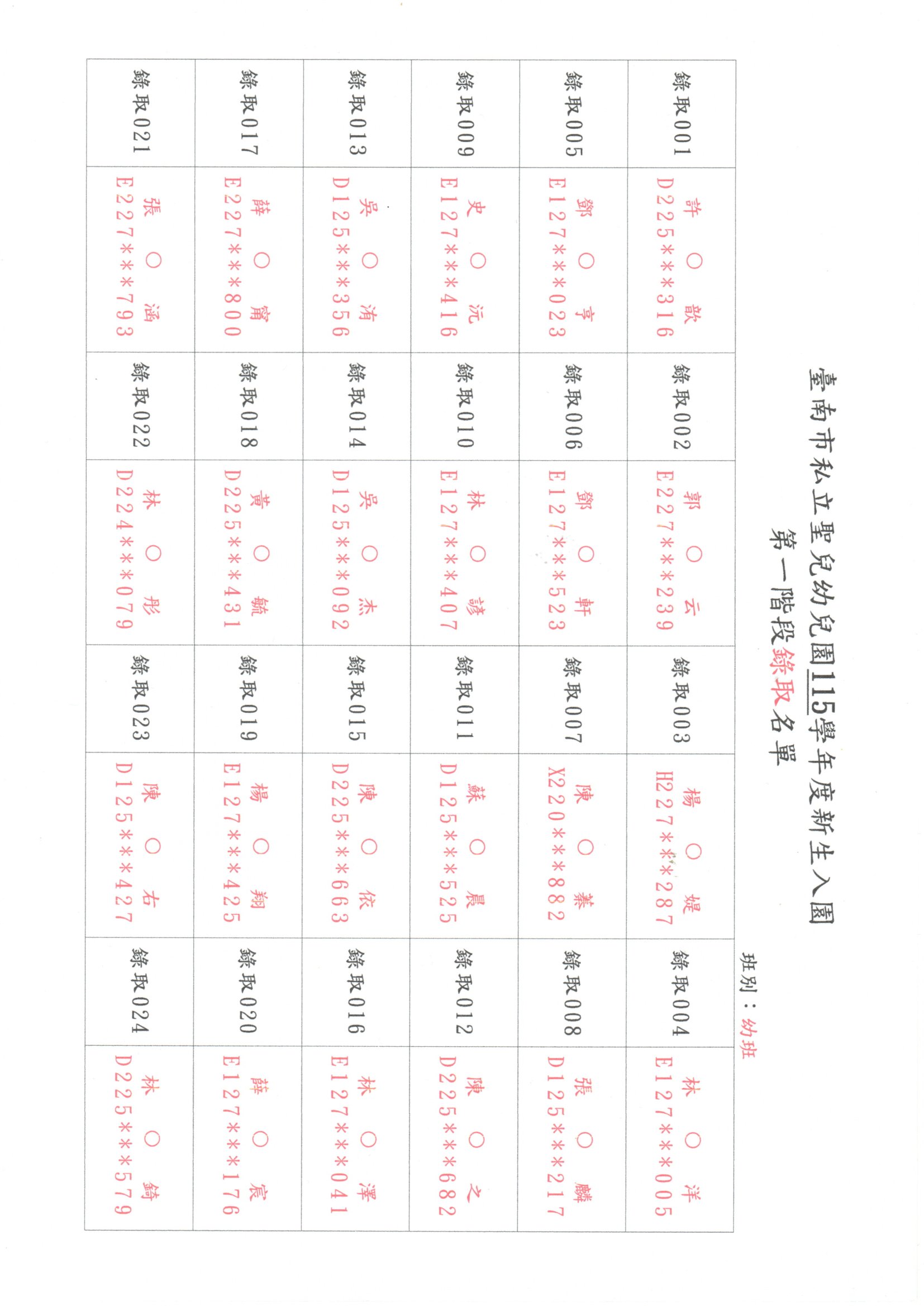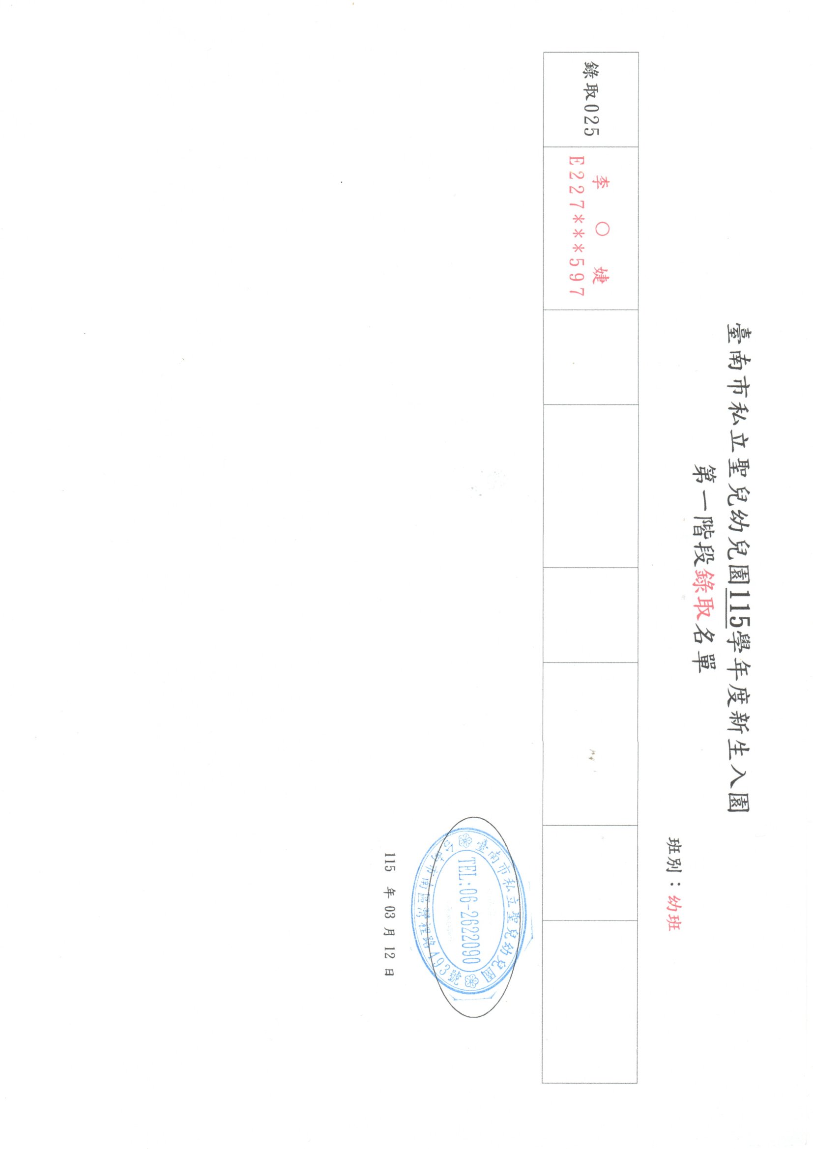 臺南市私立聖兒幼兒園115學年度新生入園第一階段錄取名單