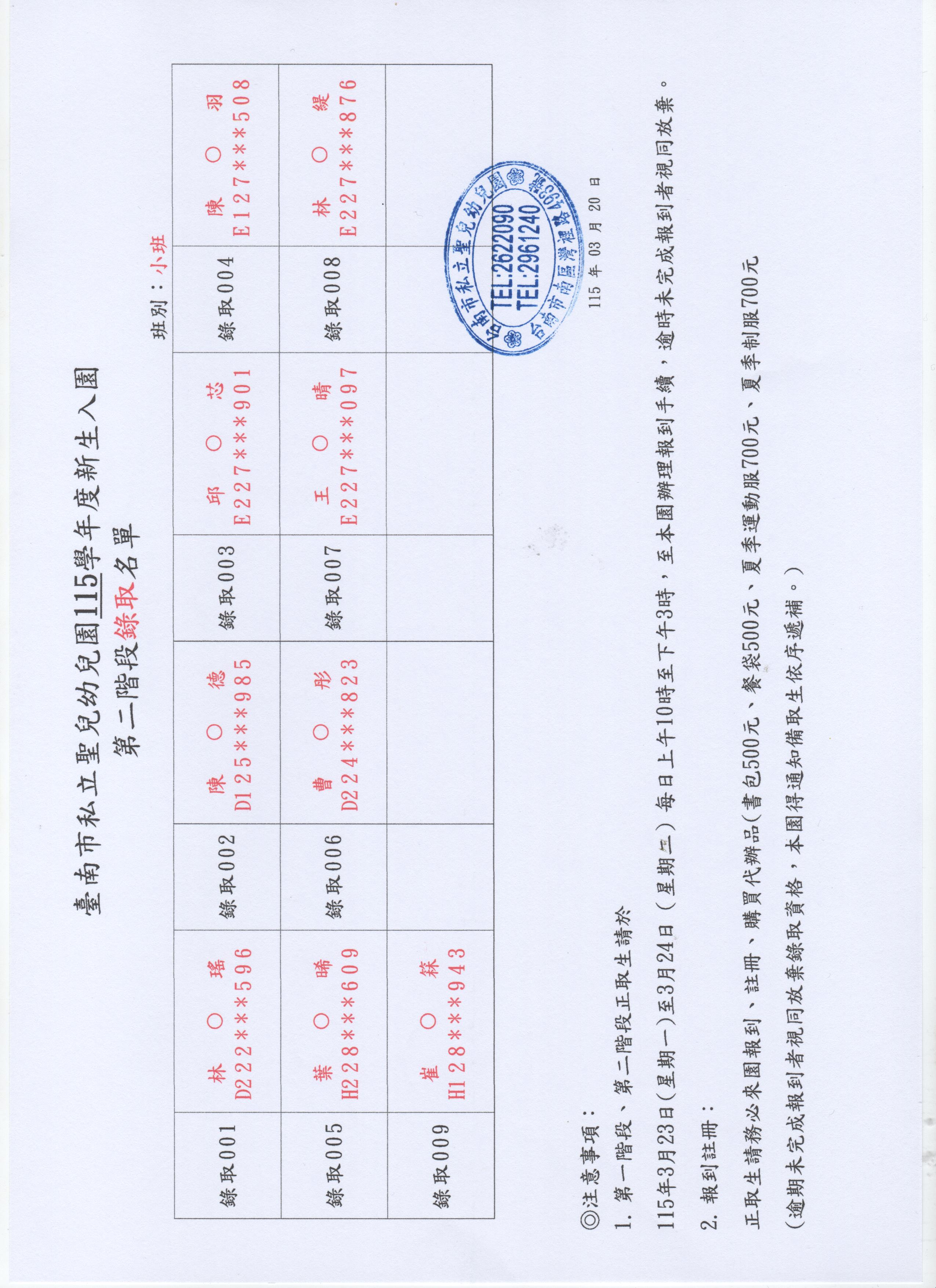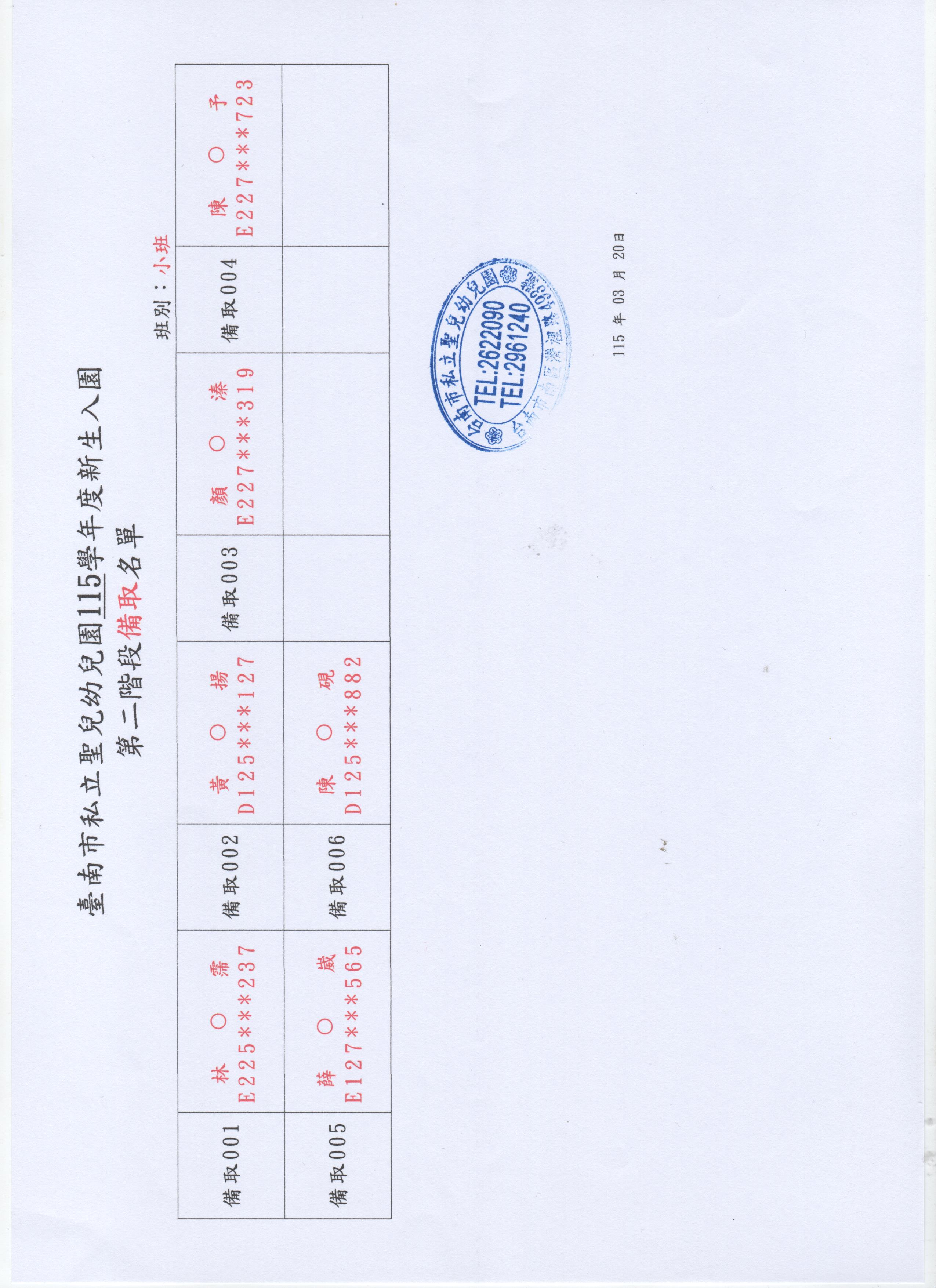 臺南市私立聖兒幼兒園115學年度新生入園第二階段錄取與備取名單【小班】