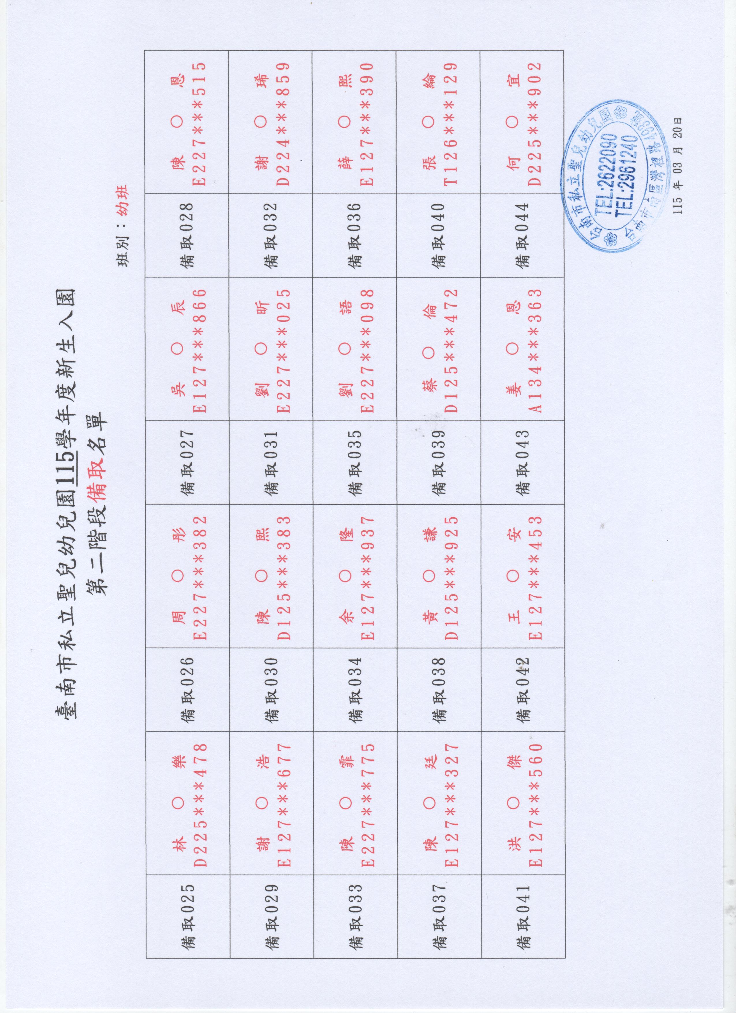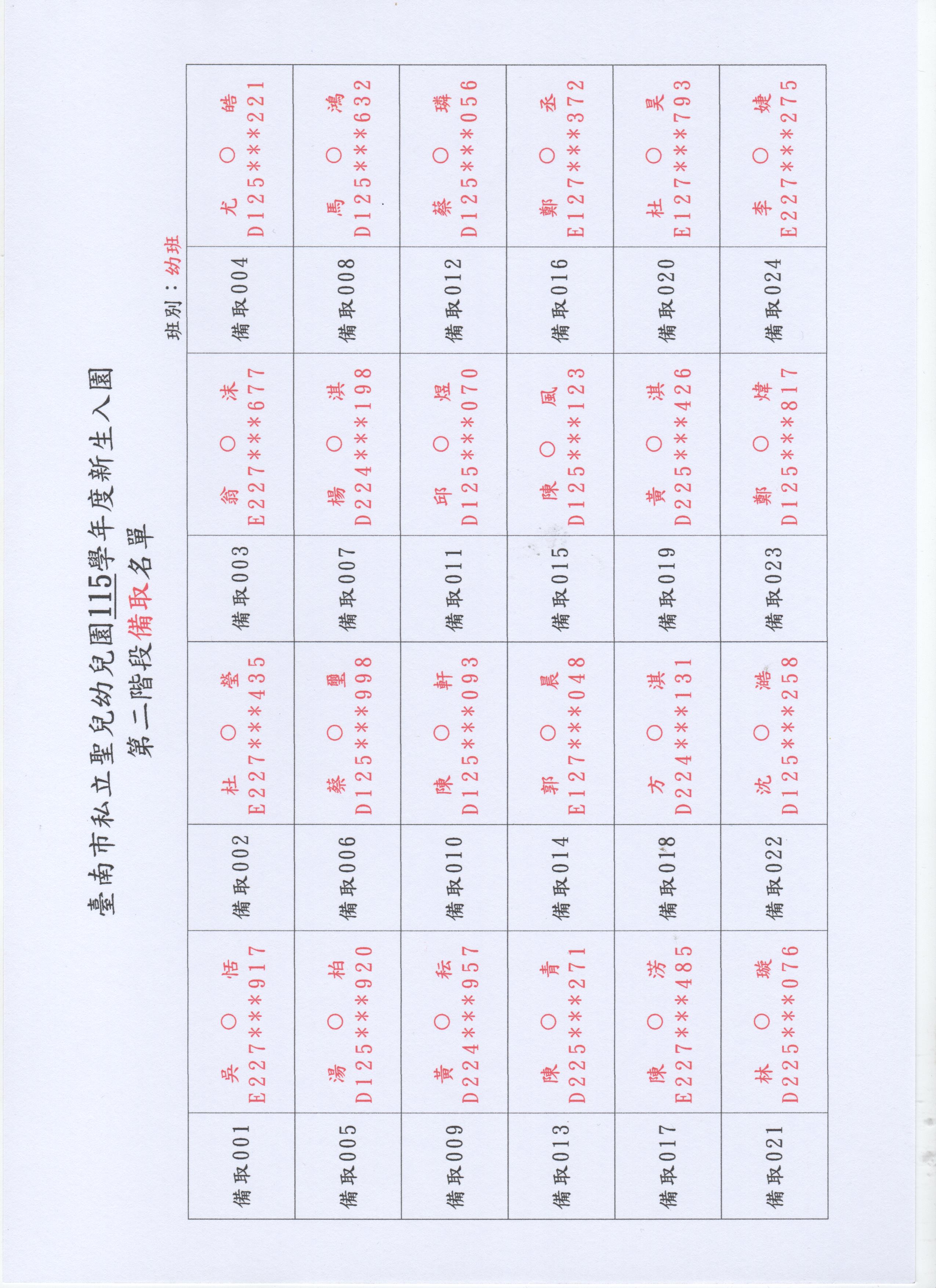 臺南市私立聖兒幼兒園115學年度新生入園第二階段錄取與備取名單【幼班】